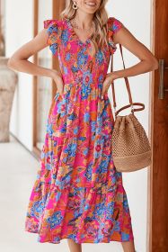 Rose Red Boho Floral V Neck Ruffle Tiered Long Dress (size: (US 16-18)XL)