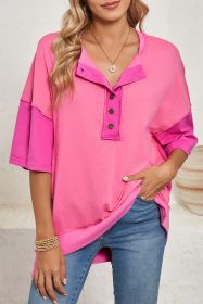Rose Red Contrast Color Patchwork Oversized Henley T Shirt (size: (US 8-10)M)