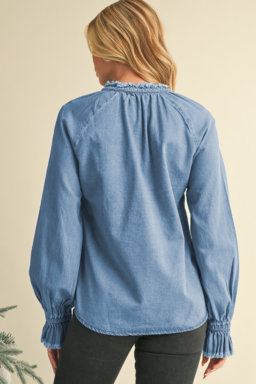 Elevate your casual look with this top, featuring a half-buttoned front that adds a touch of chic charm to your outfit. The frilled hem detail brings a playful and feminine touch to this classic denim top, perfect for a day out with friends or a casual work setting. Crafted with high-quality denim, this top offers both style and comfort with its long sleeves and relaxed fit, making it a versatile piece for any occasion. The half-buttoned design allows you to adjust the neckline to suit your style, while the sky blue hue adds a refreshing pop of color to your wardrobe. Complete your retail collection with our wholesale long sleeve tops, including this piece for a trendy and fashion-forward selection.