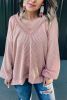 Pink V Neck Drop Shoulder Lantern Sleeve Ribbed Top