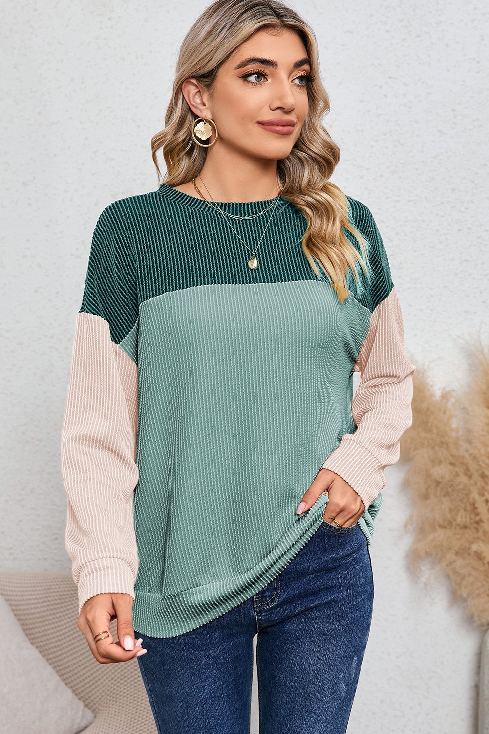 Dark Green Color Block Ribbed Loose Long Sleeve Top
