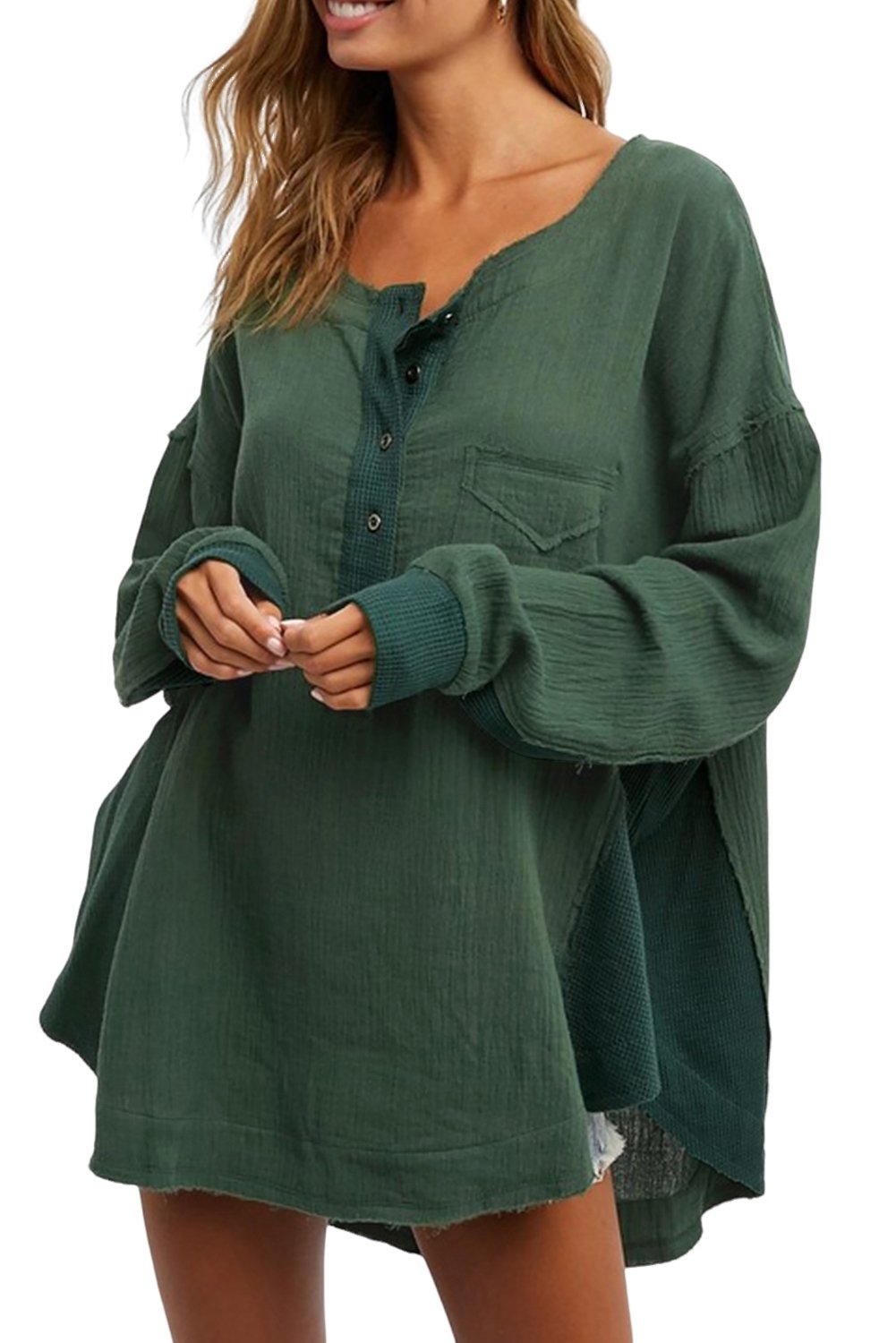 Home > Green Solid Color Crinkled Patchwork Henley Blouse