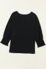 Black Plain Smocked 3/4 Sleeve Casual Loose T Shirt