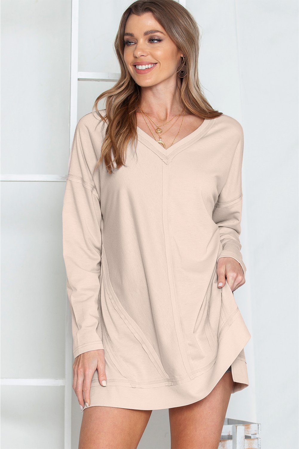 Home > Apricot Exposed Seam V Neck Side Slits Long Sleeve Top