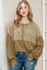 Home > Khaki Ribbed Patchwork Bishop Sleeve Henley Top