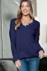 Dark Blue Ribbed Texture Lace Trim V Neck Long Sleeve Top