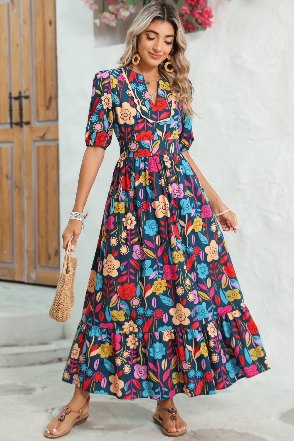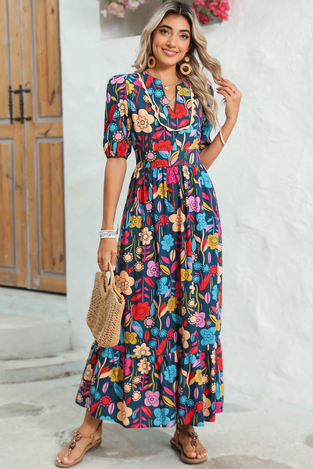 • This maxi dress features a split V neckline and puff sleeves, adding a touch of elegance and femininity to your look.