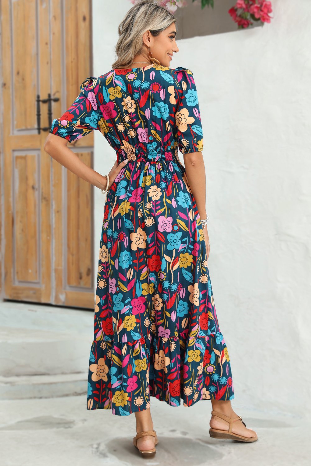Home > Green Floral Print Split V Neck Puff Sleeve Maxi Dress