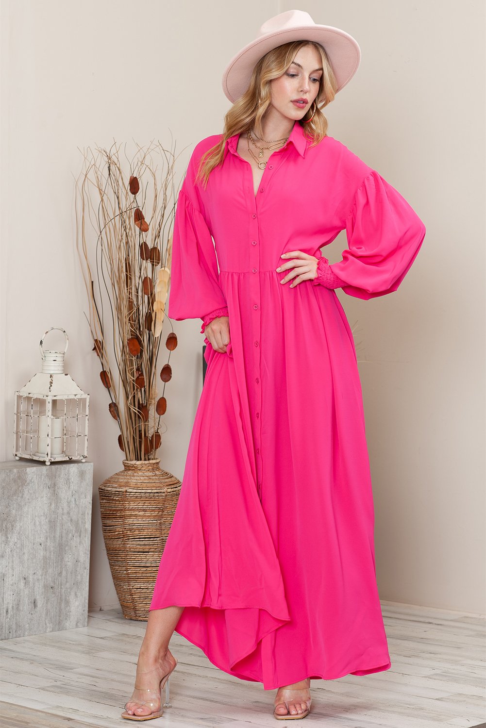 Rose Solid Color Bishop Sleeve Button Up Collared Shirt Dress