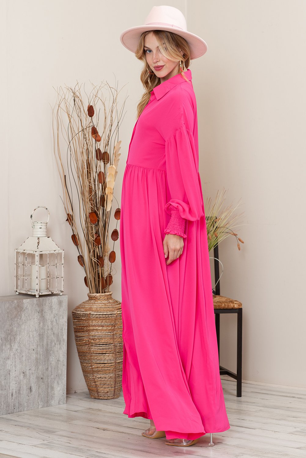 Rose Solid Color Bishop Sleeve Button Up Collared Shirt Dress