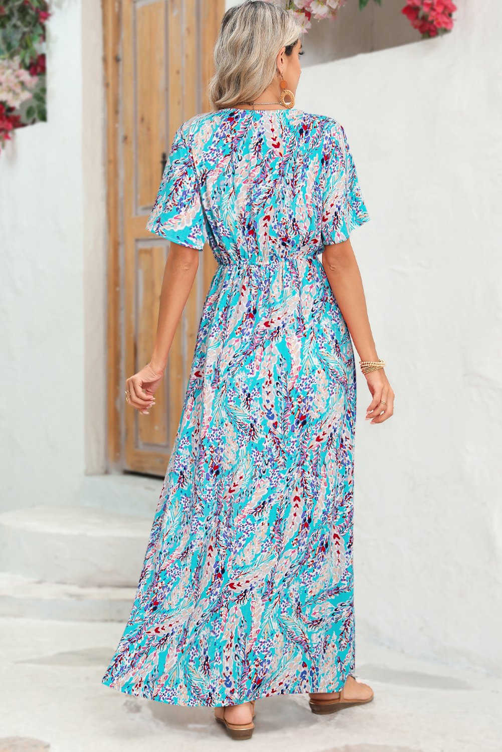 Abstract Botanic Print Wrap V Neck Short Sleeve Maxi Dress