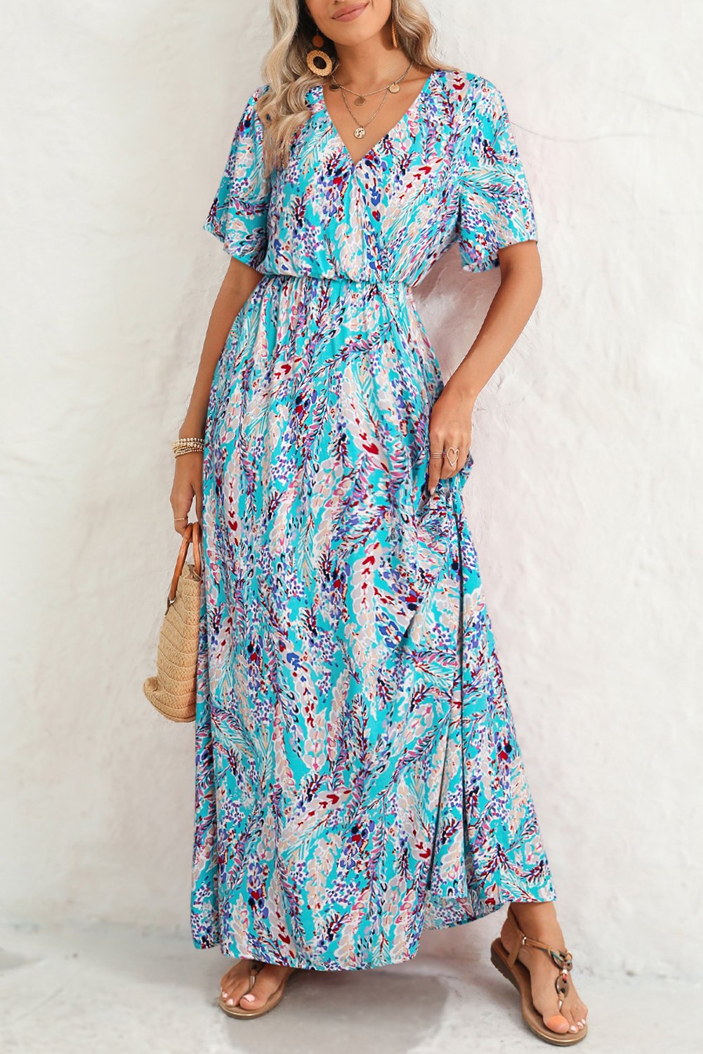 Home > Abstract Botanic Print Wrap V Neck Short Sleeve Maxi Dress