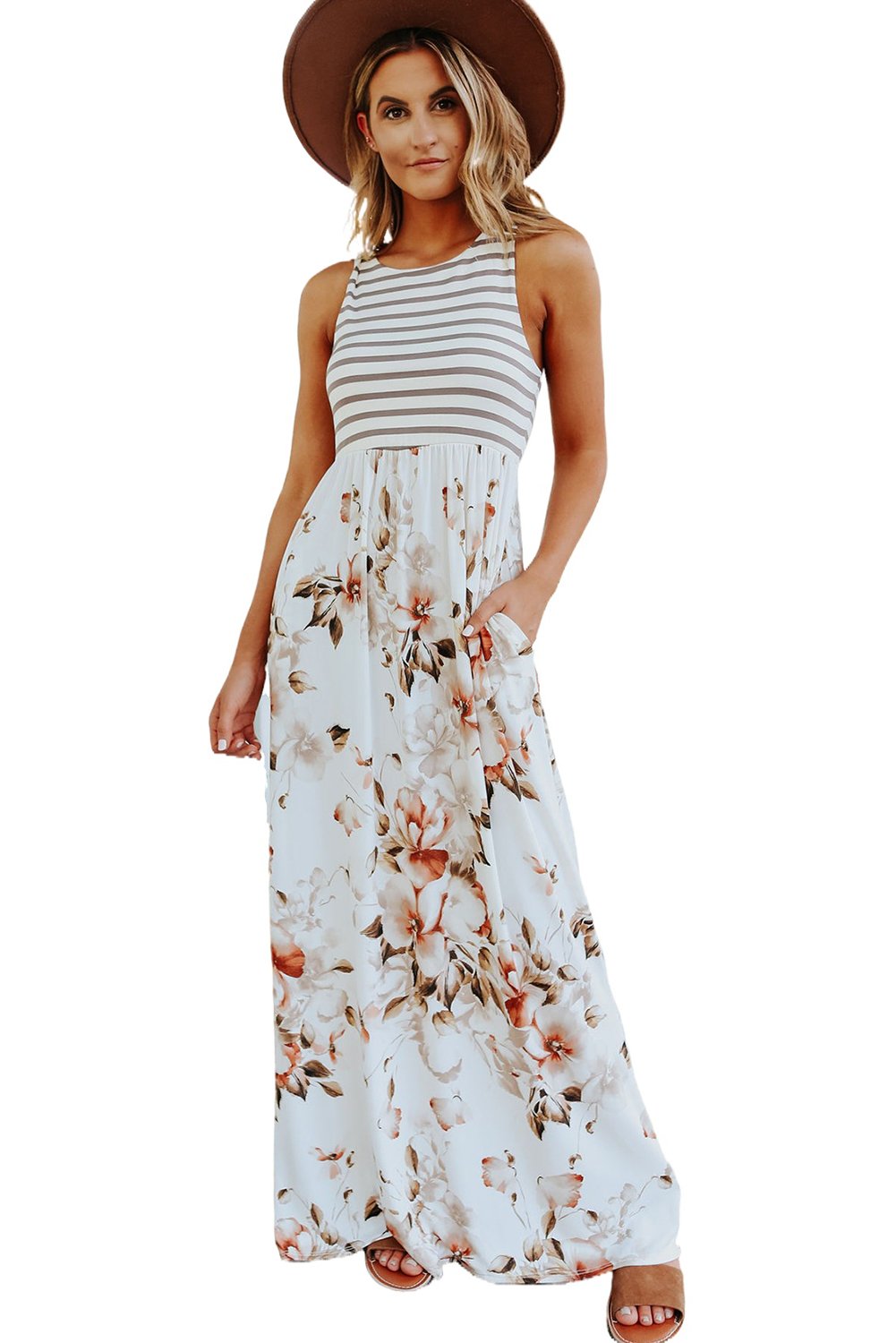 White Boho Stripes & Floral Print Floor Length Tank Dress