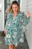 Green Boho Floral Puff Sleeve Split Neck Plus Size Dress