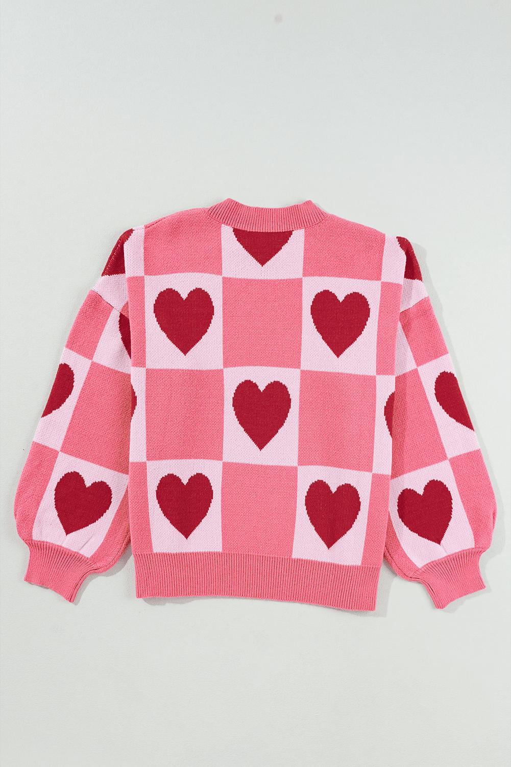 Embrace a blend of femininity and comfort with our plus size sweater, featuring a charming heart print that adds a touch of sweetness to your outfit. Stay cozy and stylish in this sweater that combines a casual vibe with a trendy plaid design, perfect for a relaxed day out or a cozy night in. Crafted with quality rib-knit fabric, this sweater ensures a snug fit while offering flexibility and breathability for all-day wear. Elevate your wardrobe with the mock neck and lantern sleeves that bring a modern twist to a classic sweater silhouette, making it a versatile piece for various occasions. Available in plus sizes, this sweater is a must-have for fashion-forward individuals who appreciate quality, style, and a pop of pink in their wardrobe. Indulge in the charm of this plus size sweater today, perfect for personal wear or for resale in wholesale.