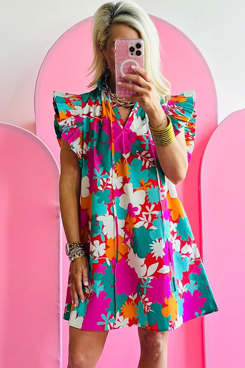 Multicolour Floral Tie Split Neck Flutter Sleeve Mini Dress