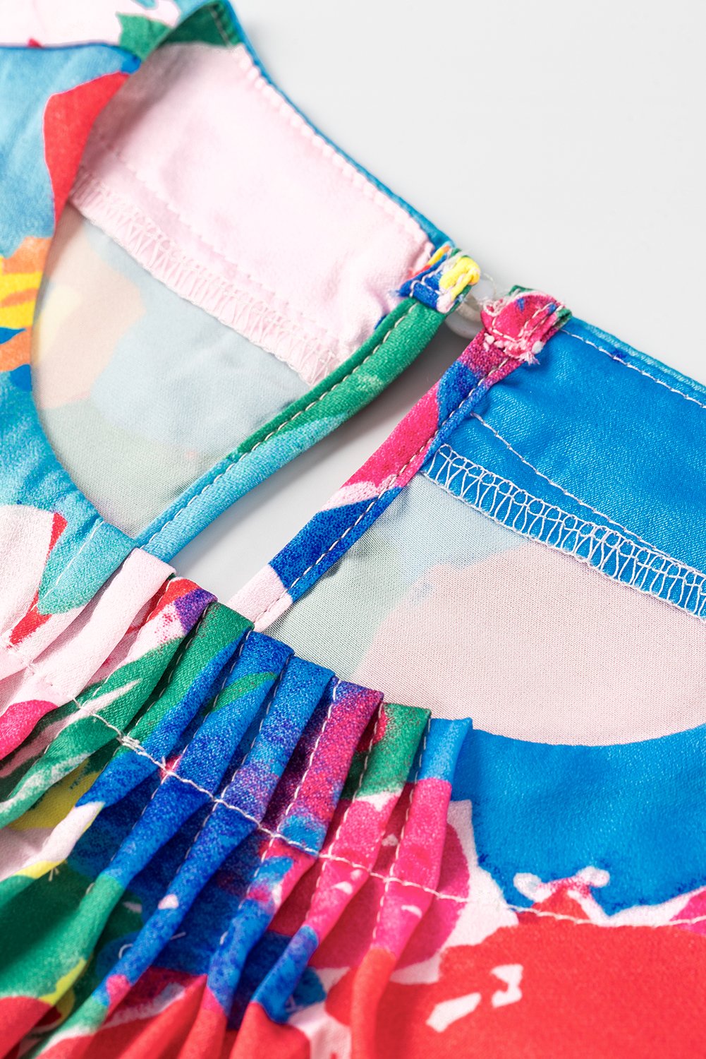 • The blouse is a vibrant and stylish top featuring an abstract print design and feminine pleated ruffle details.