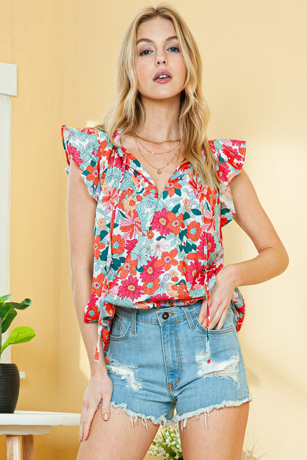 Rose Red Boho Floral Print Ruffle Tie V Neck Sleeveless Shirt