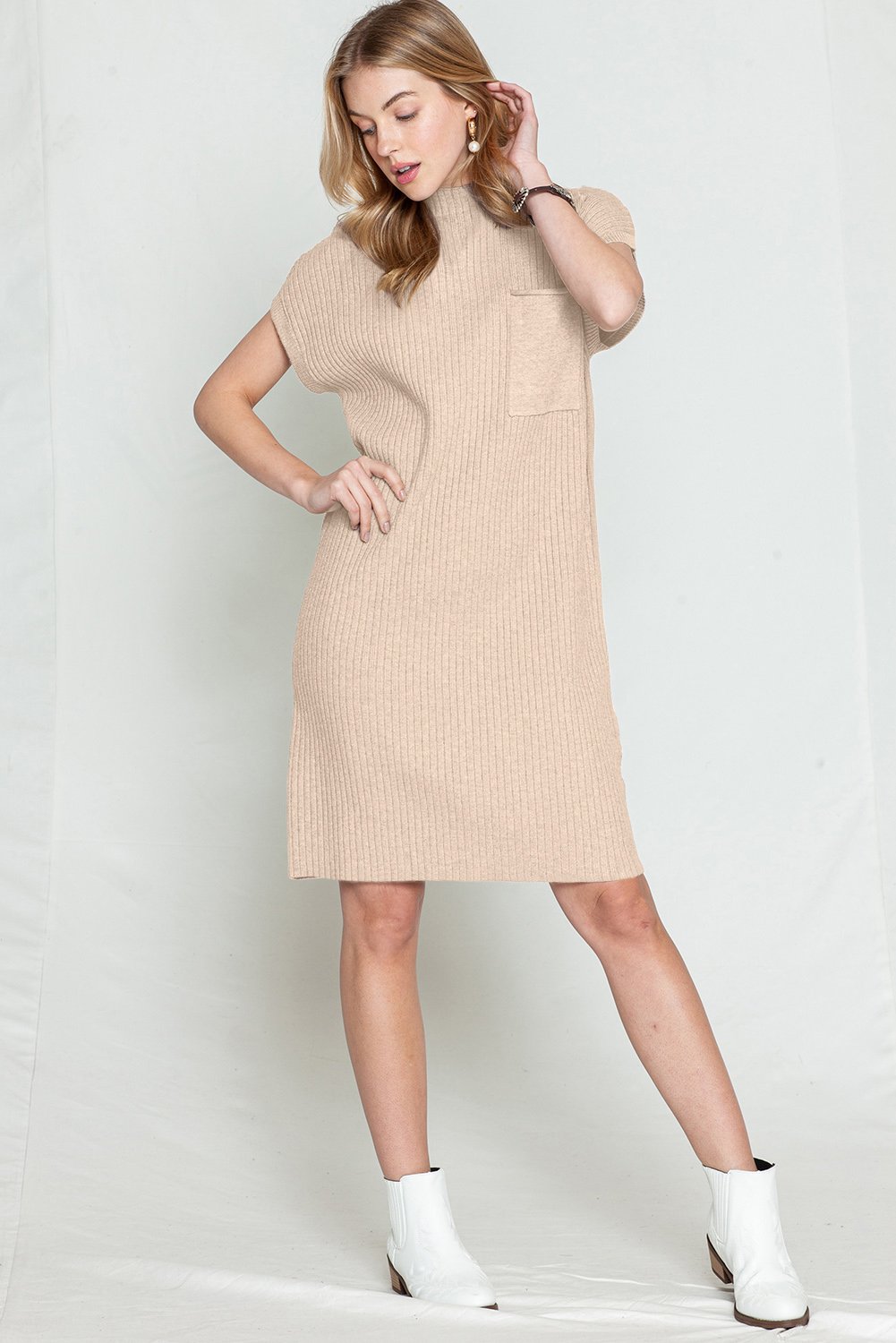 Home > Oatmeal Patch Pocket Ribbed Knit Short Sleeve Sweater Dress