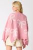 Elevate your casual look with the charming sweater, blending a touch of femininity with a trendy raw hem finish. Delicate pearl embellishments add a touch of elegance to the cozy pink sweater, perfect for adding a touch of sophistication to your everyday wardrobe. The playful bow pattern infuses a fun and flirty vibe into this versatile sweater, making it a standout piece for any casual occasion. Enjoy the comfort of the soft fabric while showcasing your unique style with this sweater that effortlessly combines comfort and chic design. Perfect for boutique owners looking to stock up on trendy pieces, this sweater is a must-have for wholesale buyers seeking stylish, high-quality garments.