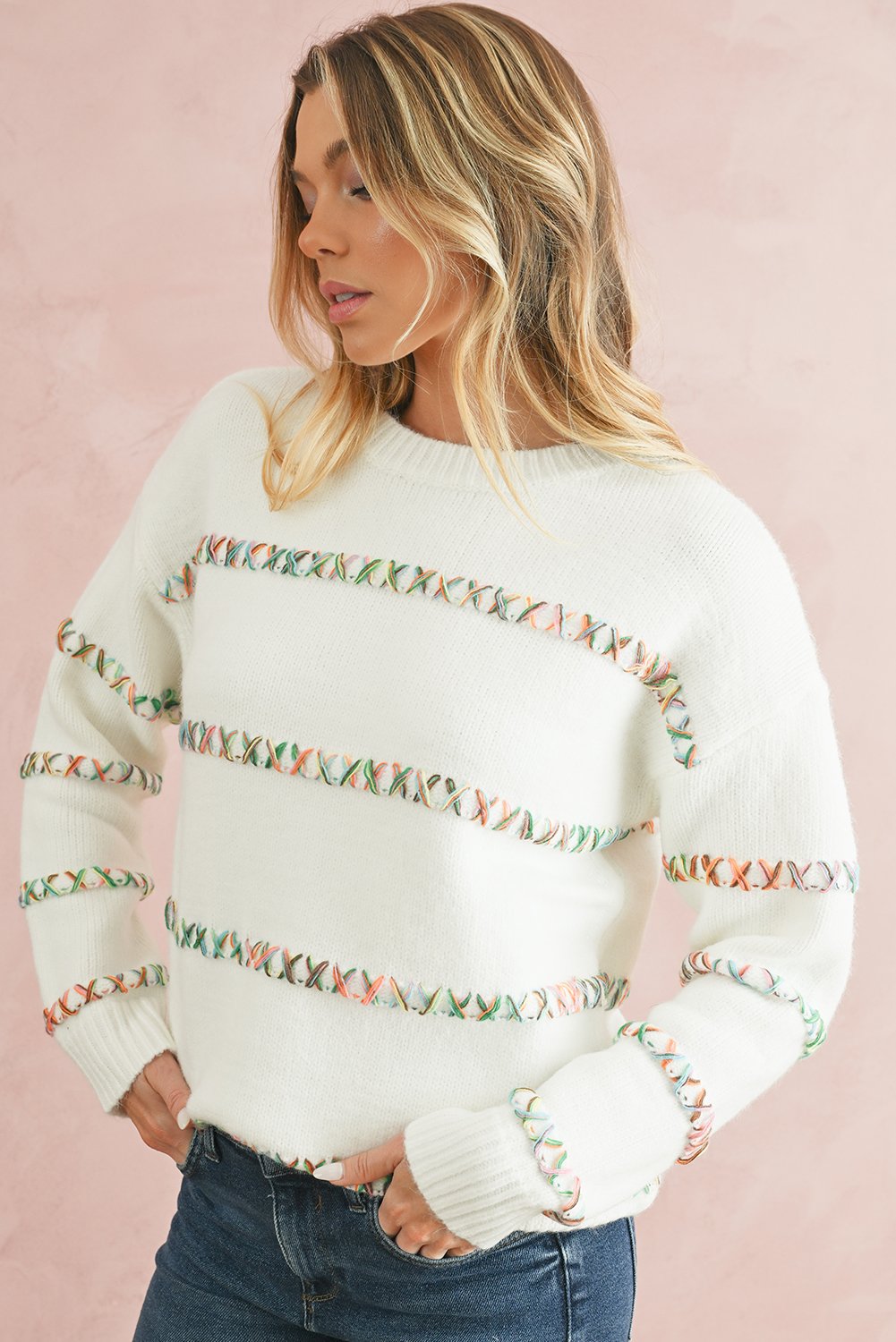 White Colorful Cross Stitch Drop Shoulder Sweater
