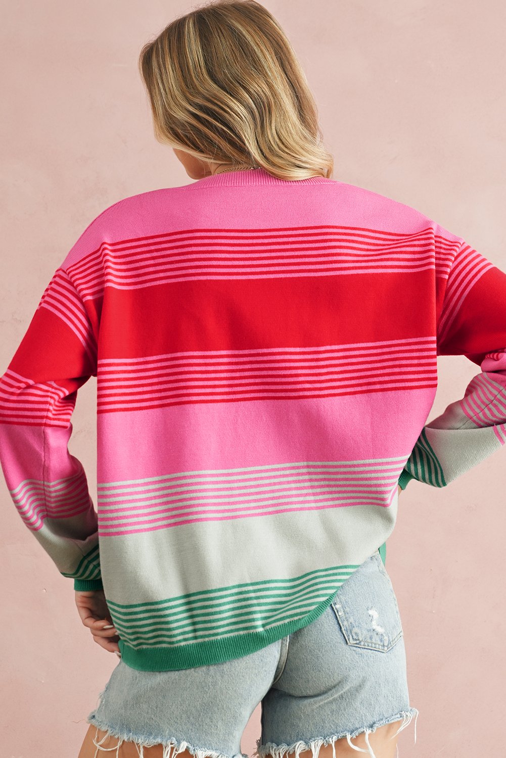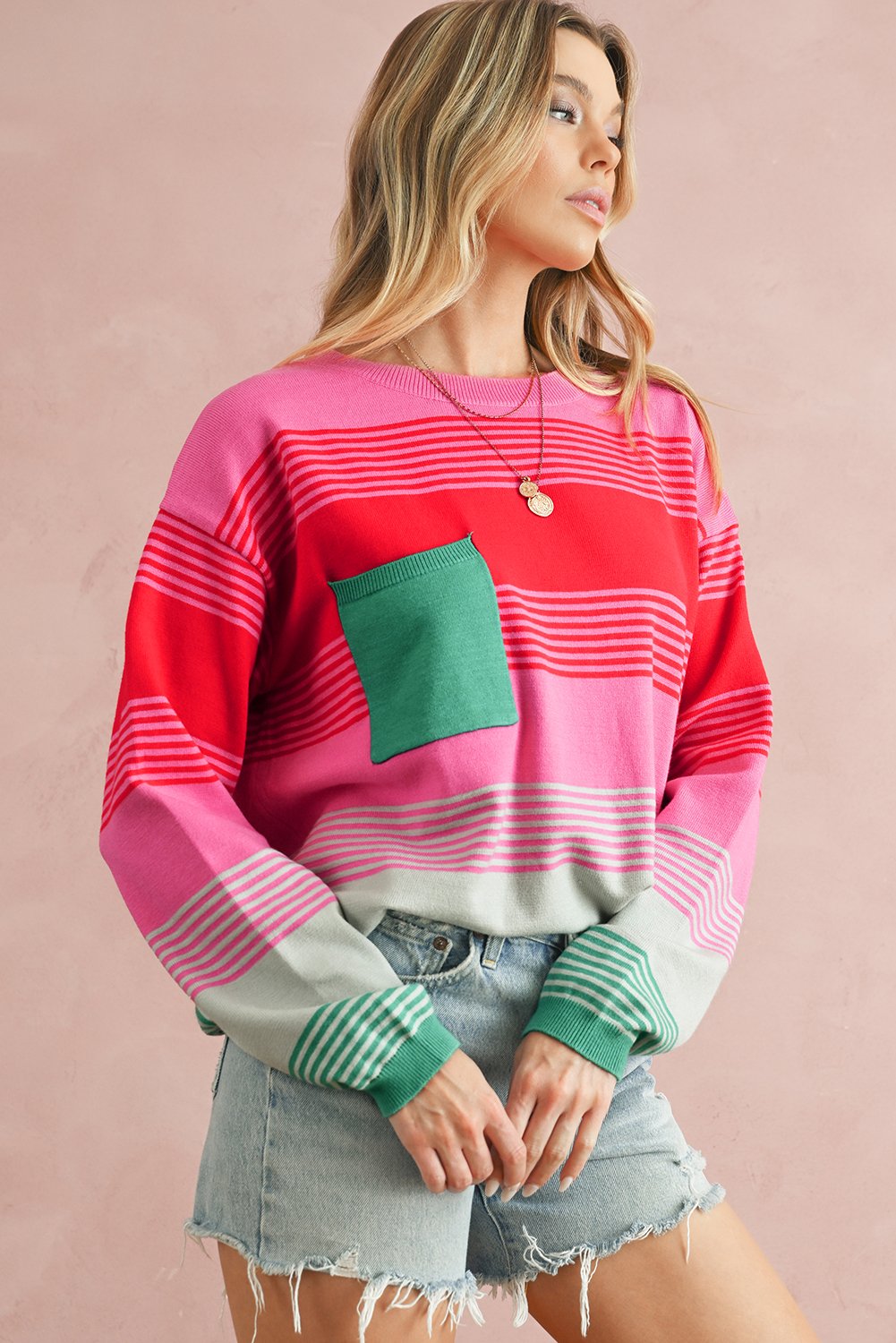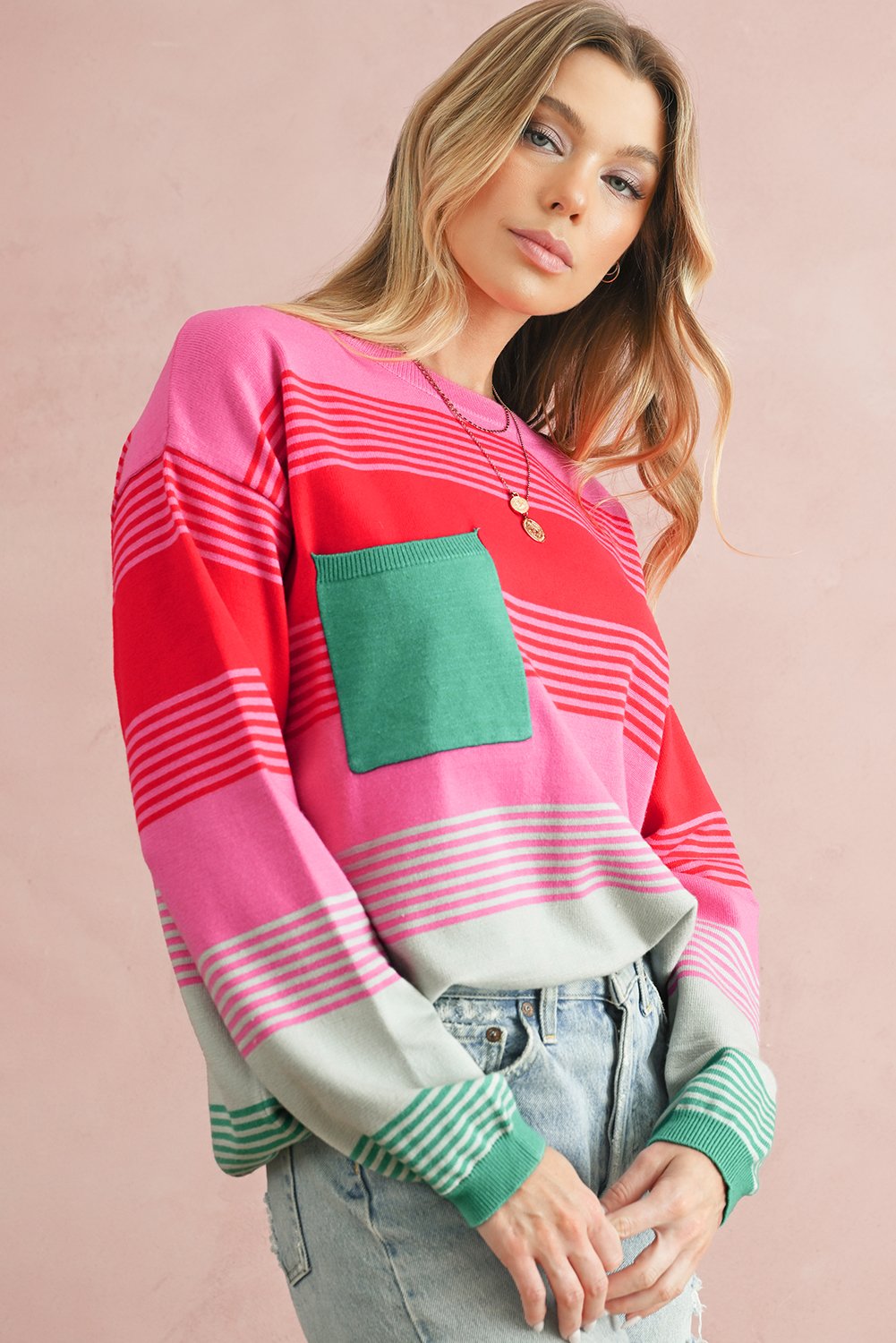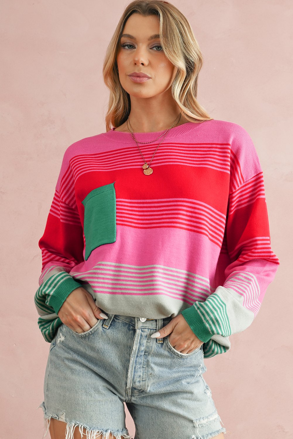 Rose Striped Patch Pocket Drop Shoulder Knit Sweater
