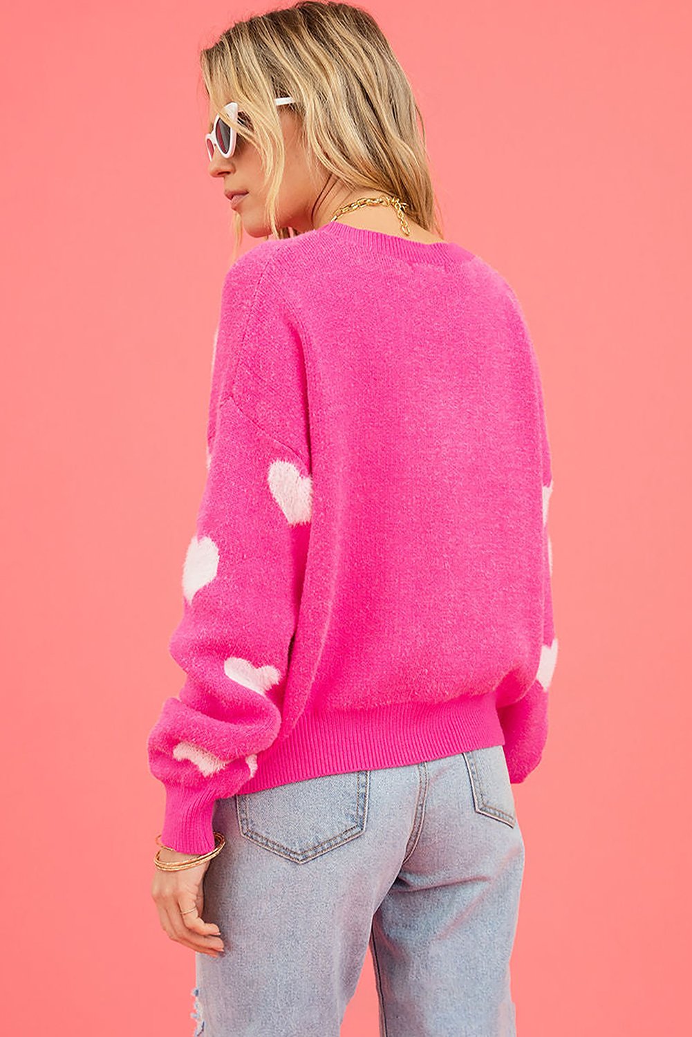 Bright Pink Fuzzy Valentine Hearts Drop Shoulder Sweater