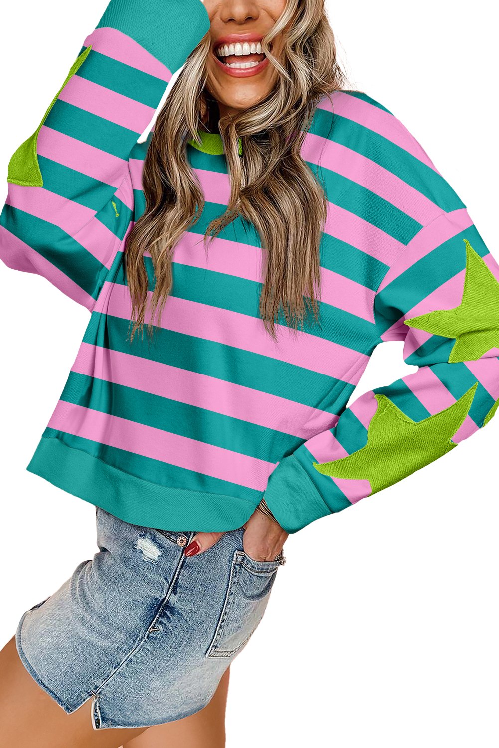 Pink Stripe Star Patchwork Round Neck Pullover Sweatshirt