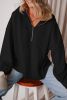 Black Half Zipper Kangaroo Pockets Drop Shoulder Hoodie