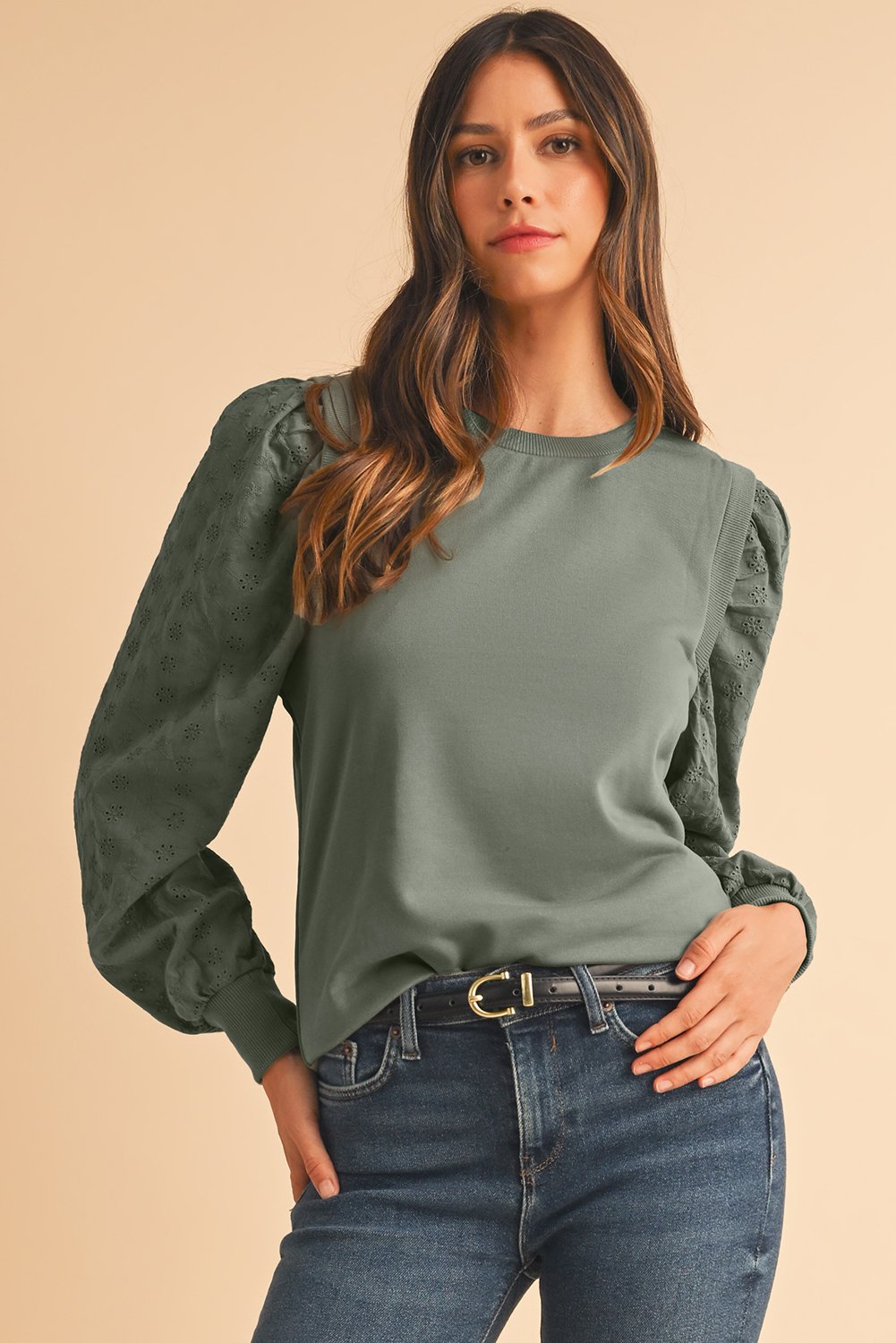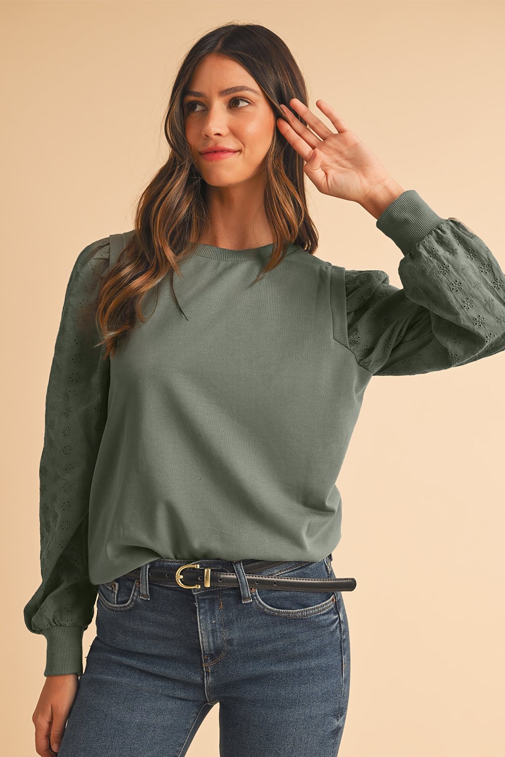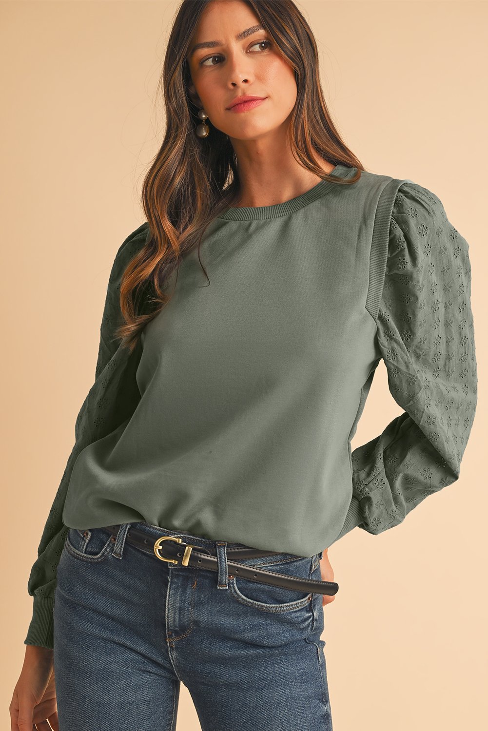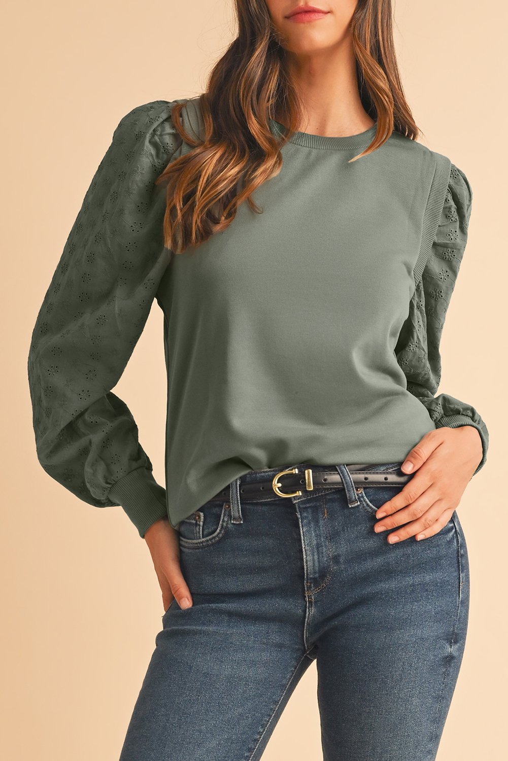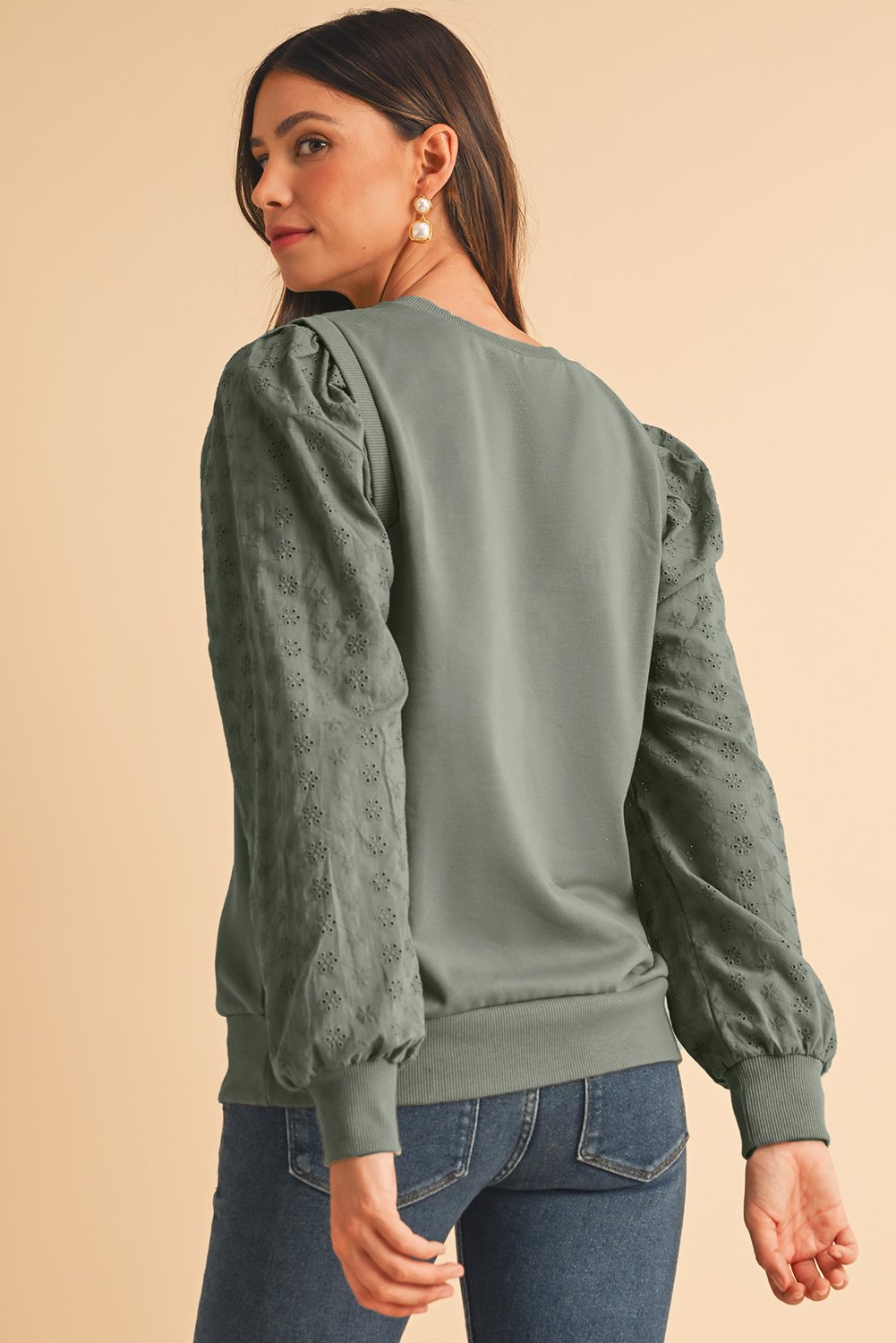 The eyelet embroidered sleeves add a touch of elegance to this cozy sweatshirt, making it a versatile piece that can be dressed up or down for any occasion.