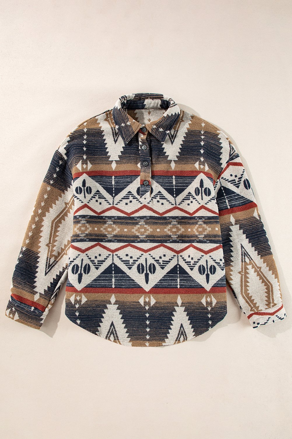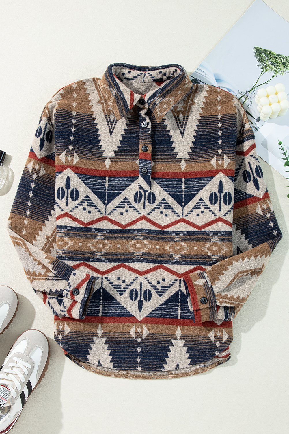 Stay cozy and stylish with this Brown Geometric Print Henley Collared Sweatshirt, featuring a convenient pocket for added functionality. Embrace comfort with the long sleeves and V-neck design of this sweatshirt, perfect for casual outings or lounging at home. The geometric print adds a trendy touch to this versatile sweatshirt, making it a great addition to your daily rotation. Enjoy the relaxed fit of this sweatshirt, ideal for effortless daily shifts from work to leisure activities. Stock up on this fashionable sweatshirt for your retail store or boutique at wholesale prices to attract customers with its unique design.