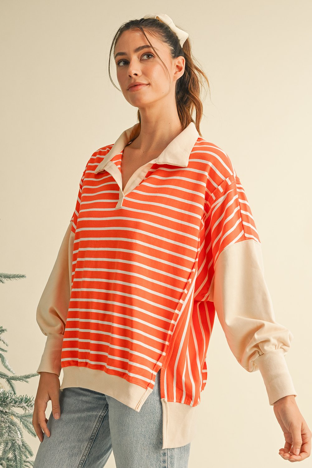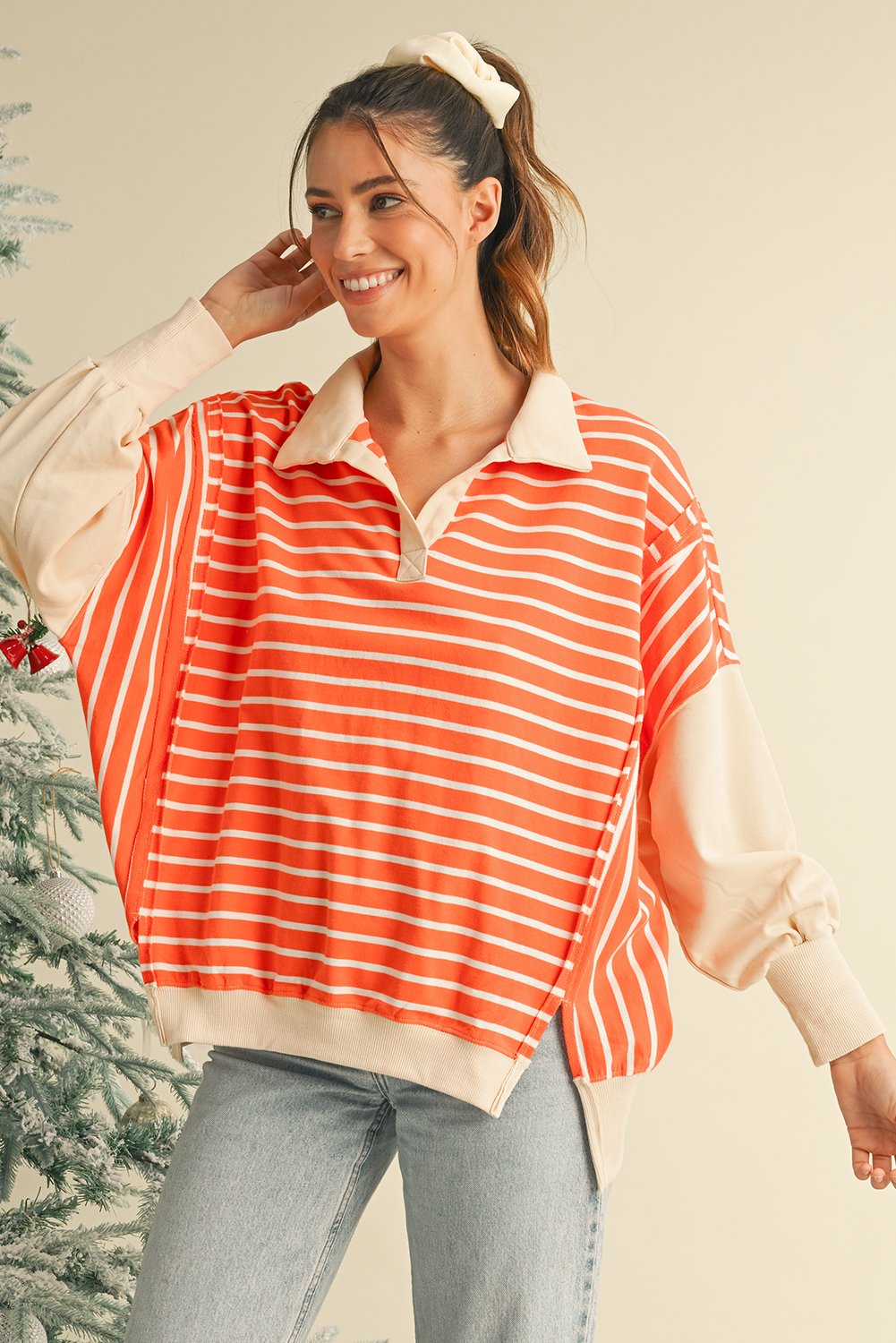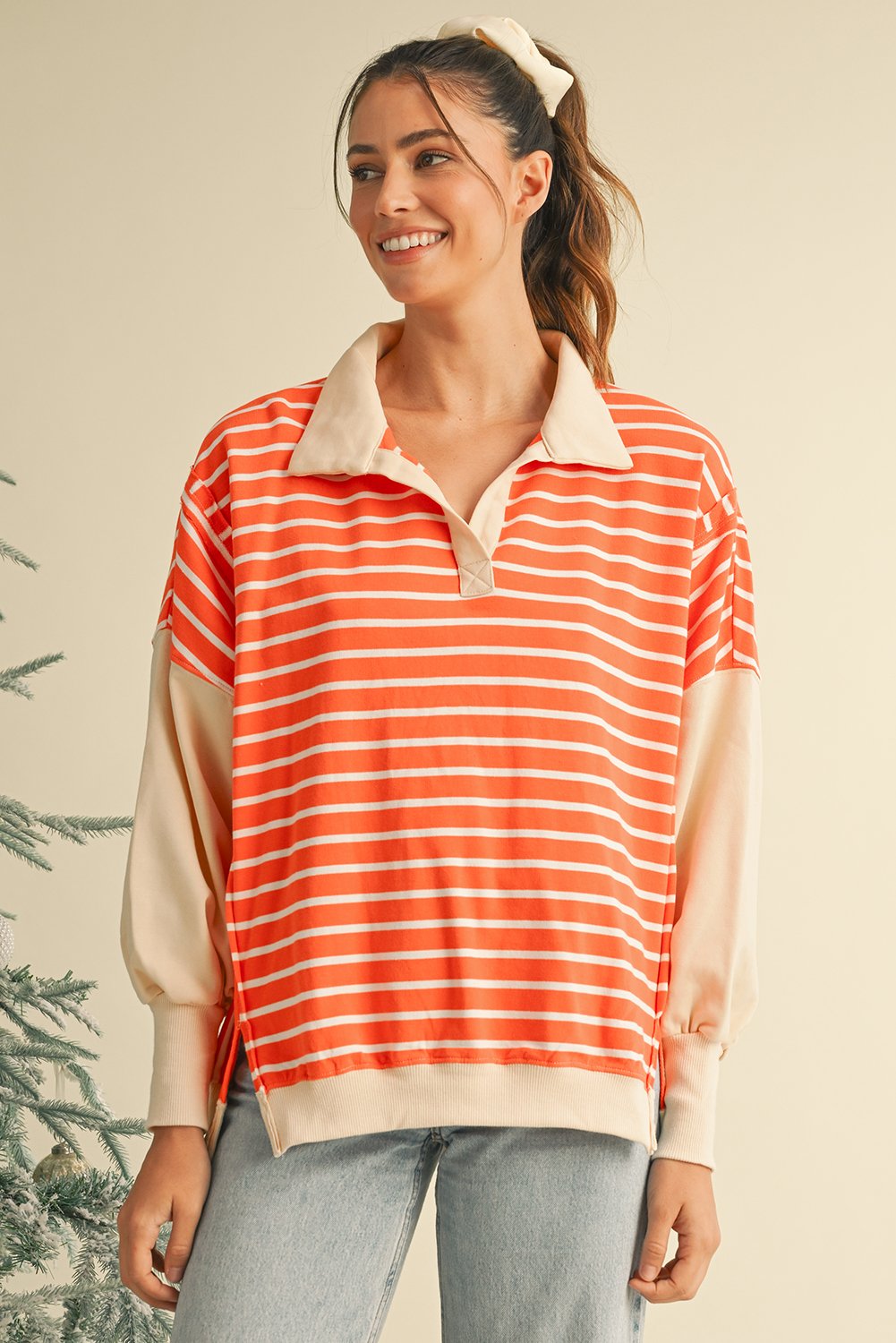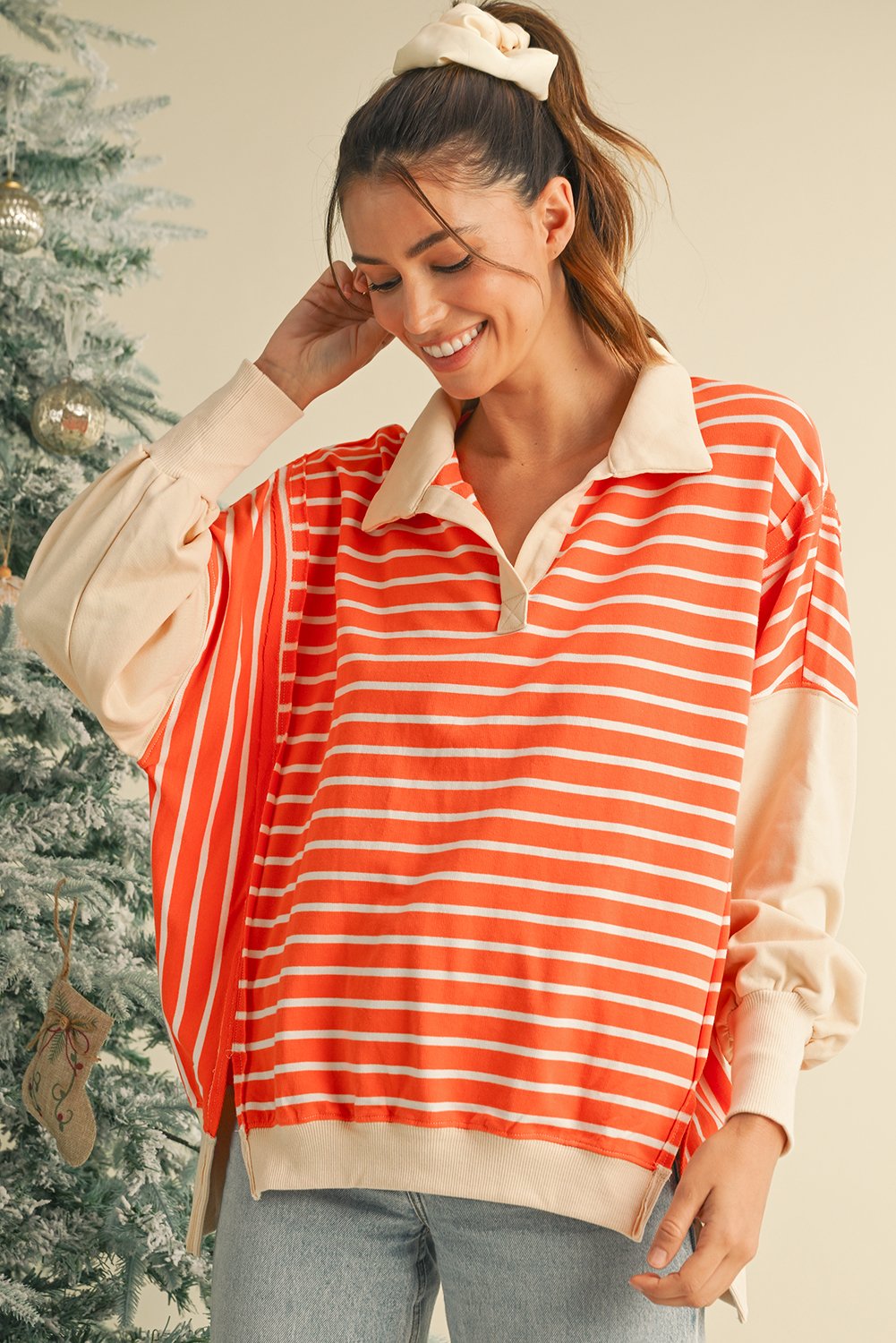 Home > Orange Stripe Color Block Loose Fit Collared Drop Shoulder Sweatshirt