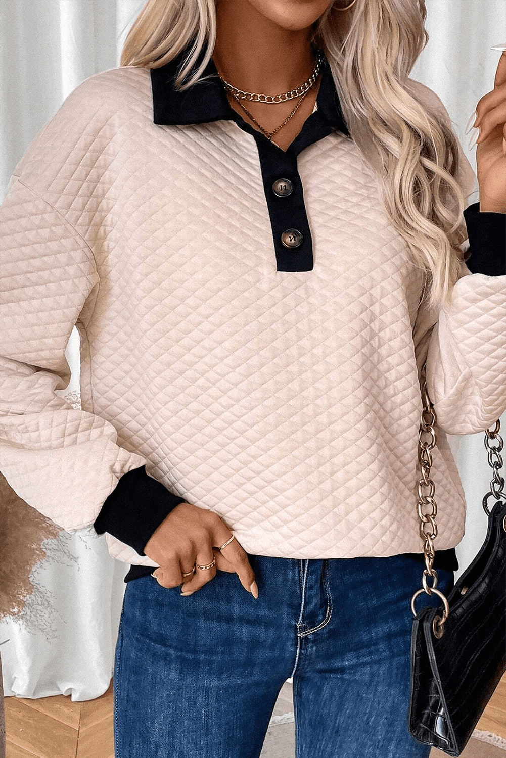Home > Oatmeal Checked Texture Patchwork Edge Button Collared Sweatshirt