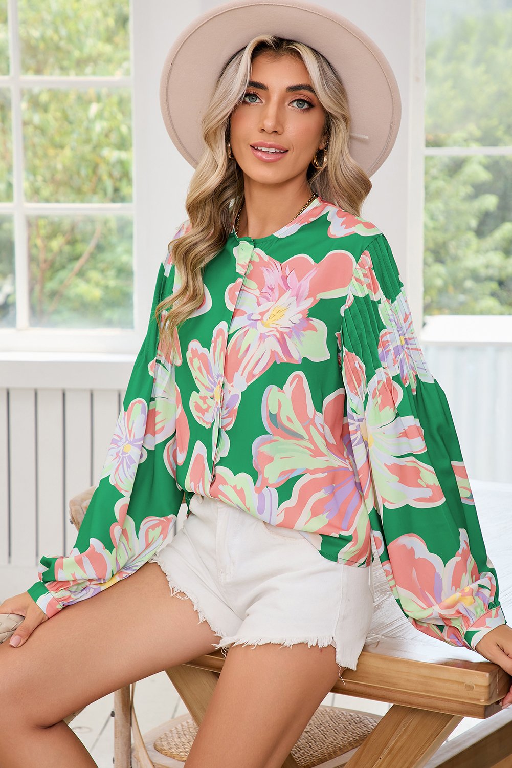 Home > Green Floral Pleated Puff Sleeve Blouse