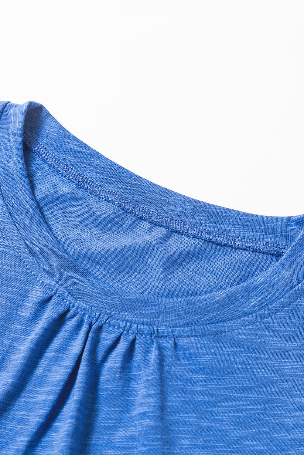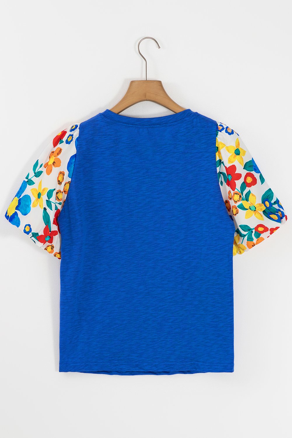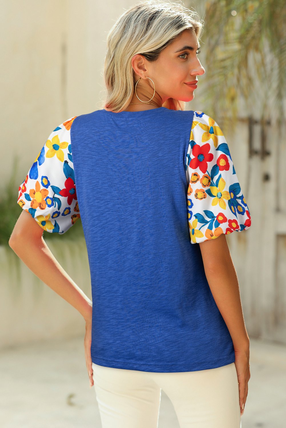 Blue Floral Print Puff Sleeve Round Neck Blouse