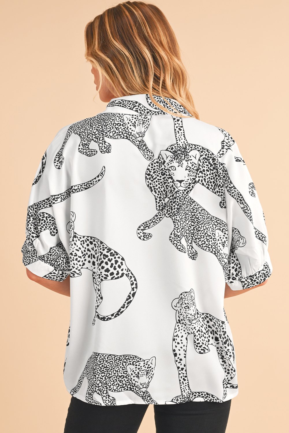 Beige Cheetah Print Buttoned Half Sleeve Blouse