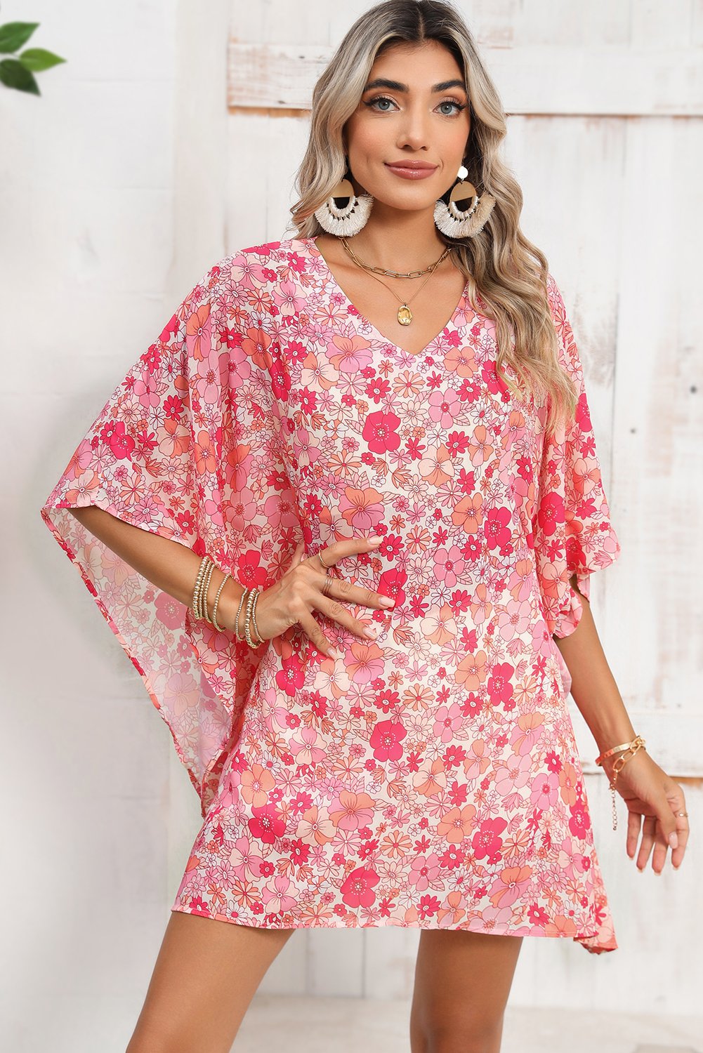 Home > Pink Boho Floral Print V Neck Oversized Blouse