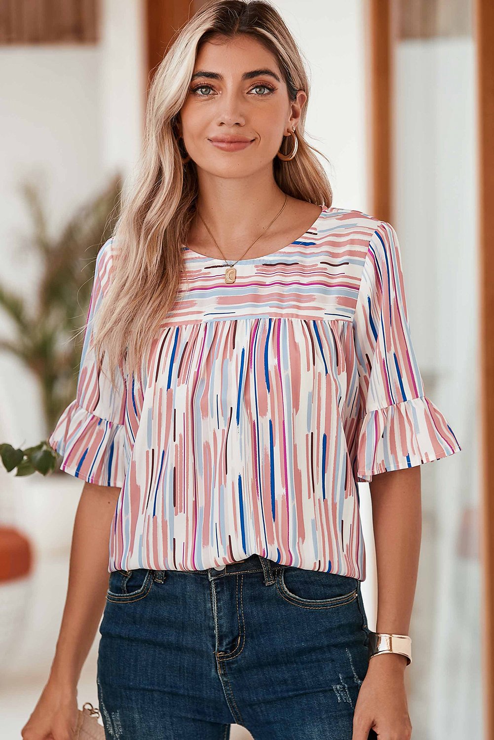 • The blouse showcases a striped pattern, which adds a playful and dynamic element to the overall look. The striped pattern adds visual interest and creates a flattering effect.