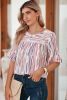 • The blouse showcases a striped pattern, which adds a playful and dynamic element to the overall look. The striped pattern adds visual interest and creates a flattering effect.