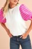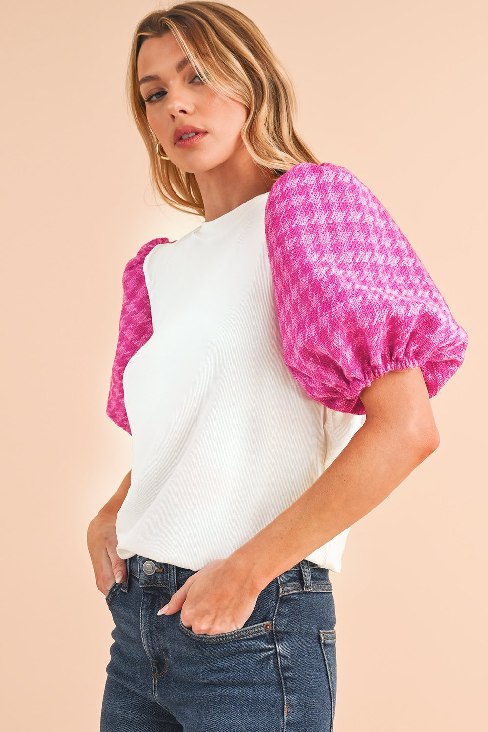 White Tweed Lantern Sleeve Patchwork Blouse