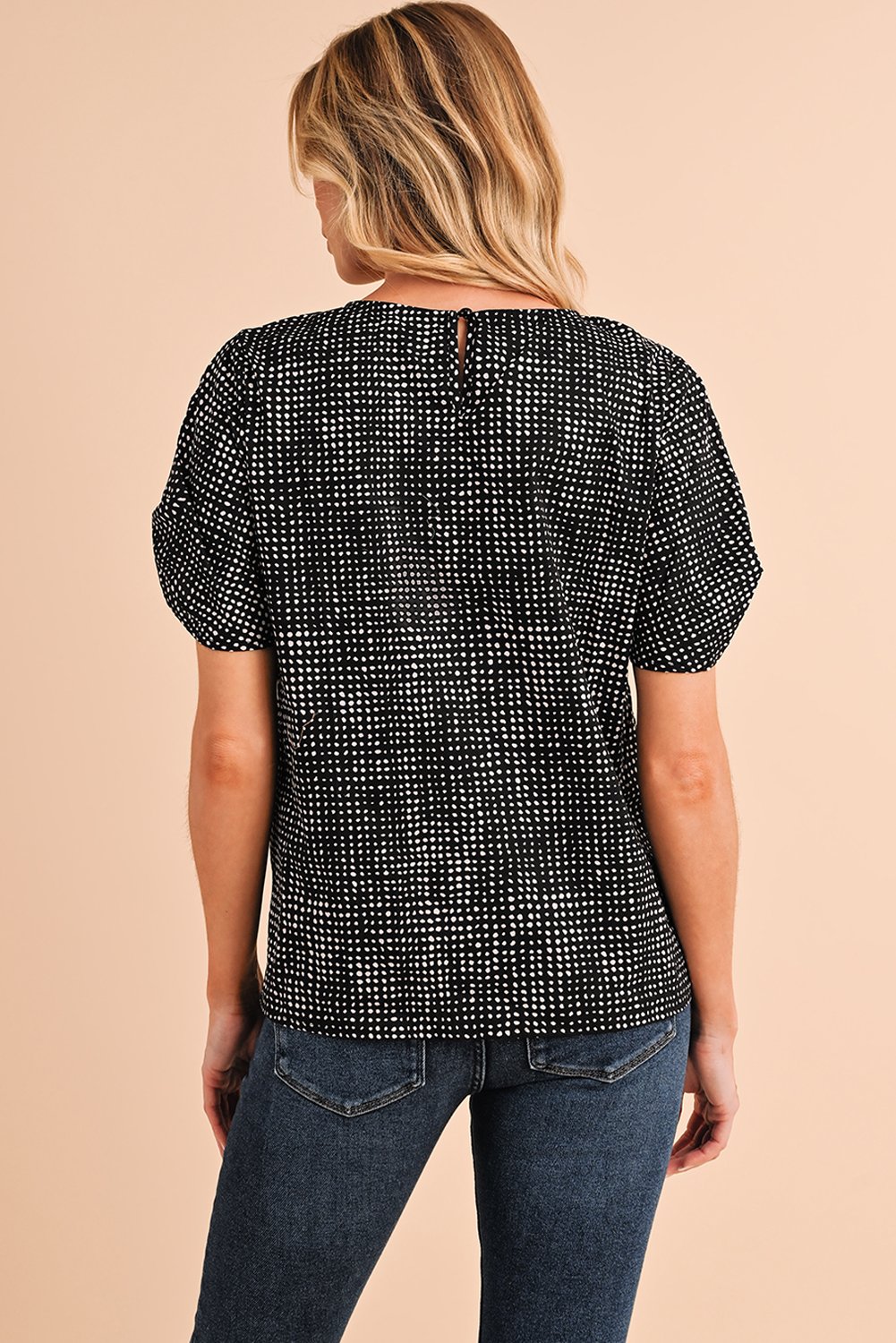 Home > Black Dotted Puff Sleeve Round Neck Blouse