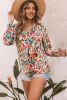 Multicolor Abstract Print Boho V Neck Shirred Cuffs Blouse