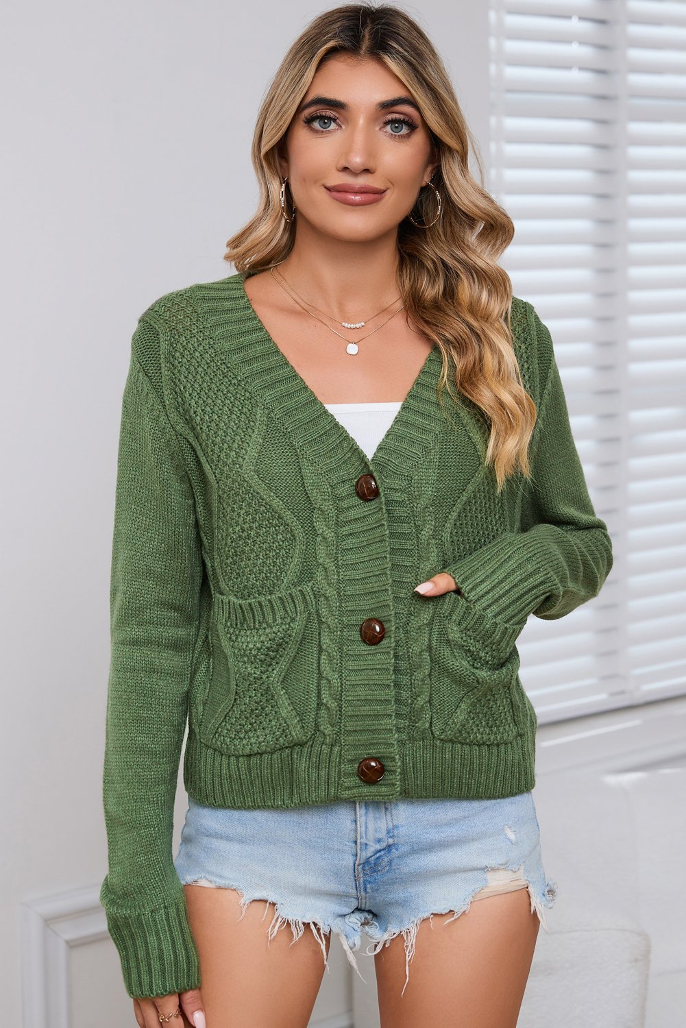 Home > Green Pockets Buttons Textured Cropped Sweater Cardigan