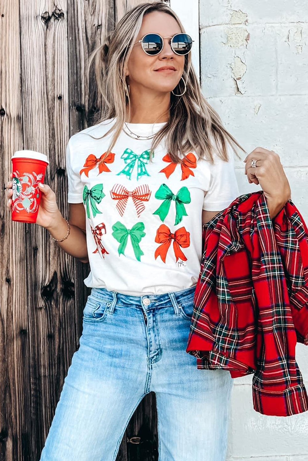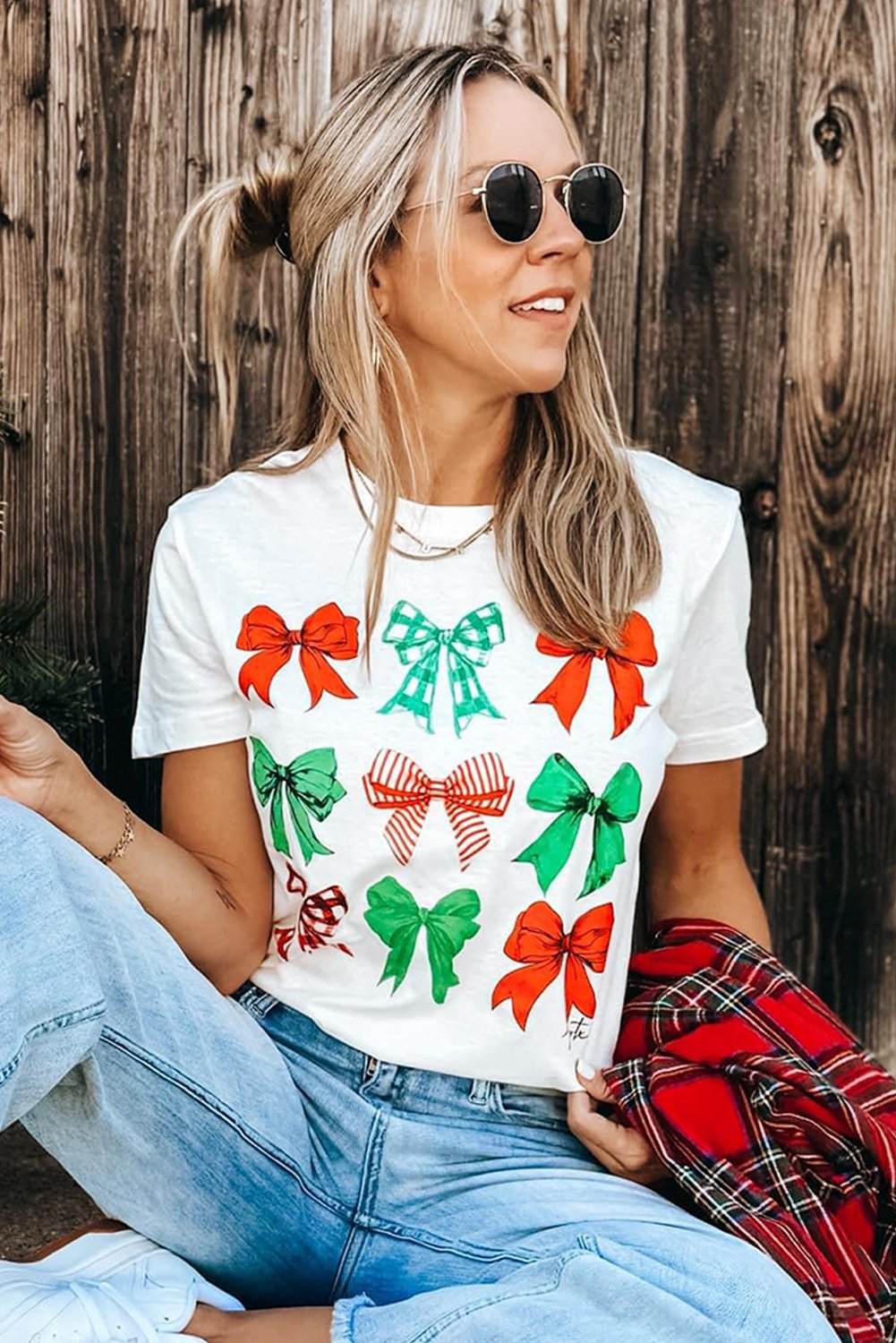 • Stand out in elegance with the white Christmas bowknot graphic t-shirt, perfect for any occasion.