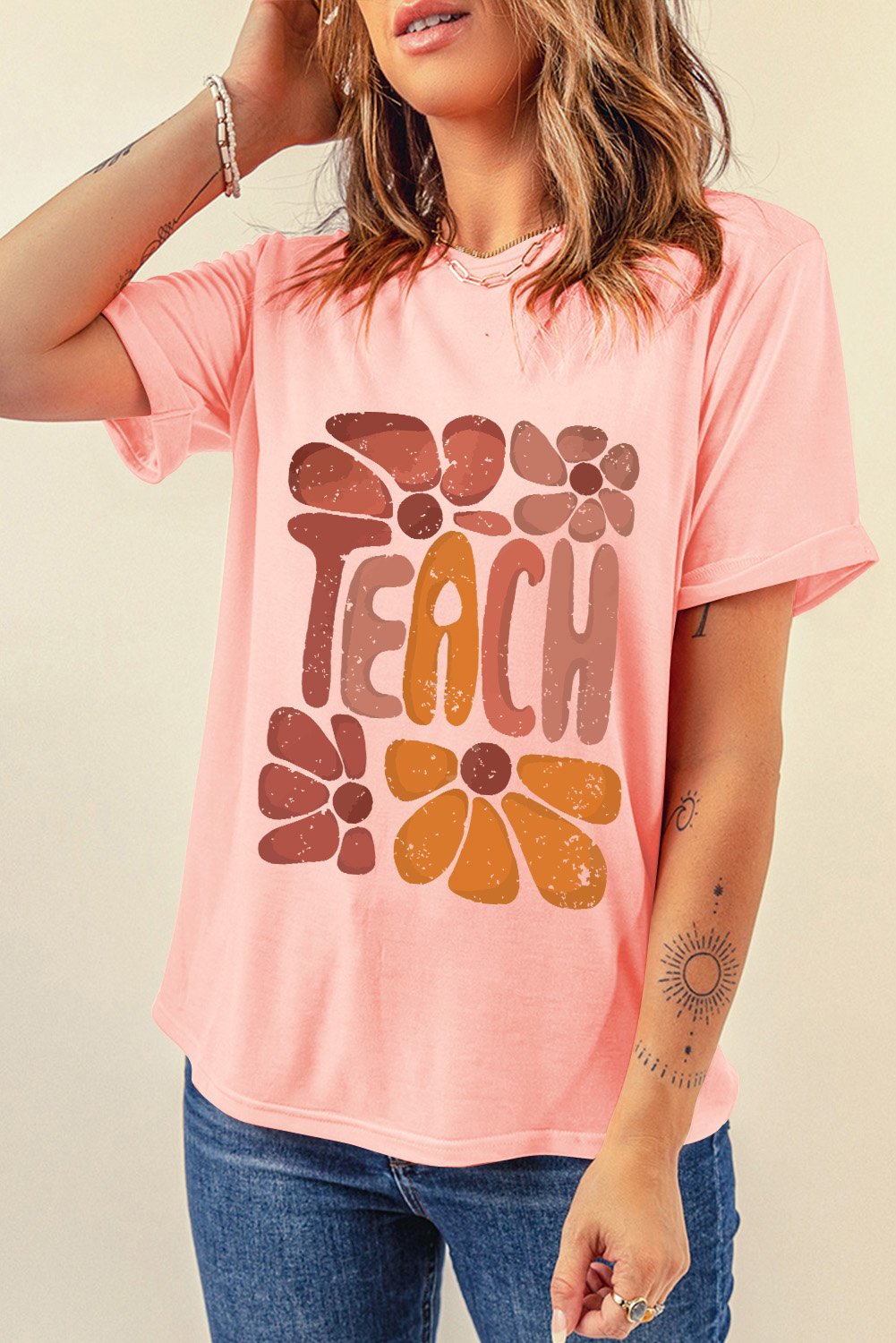Home > Pink TEACH Crew Neck Casual T Shirt