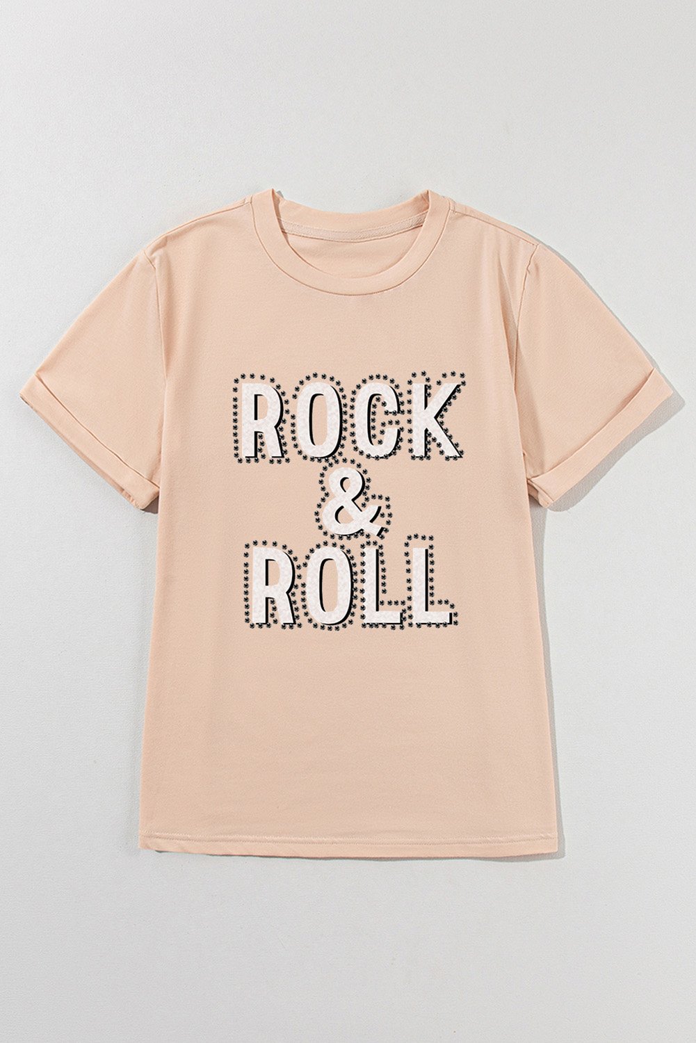 Home > Khaki Rhinestone ROCK & ROLL Graphic T Shirt