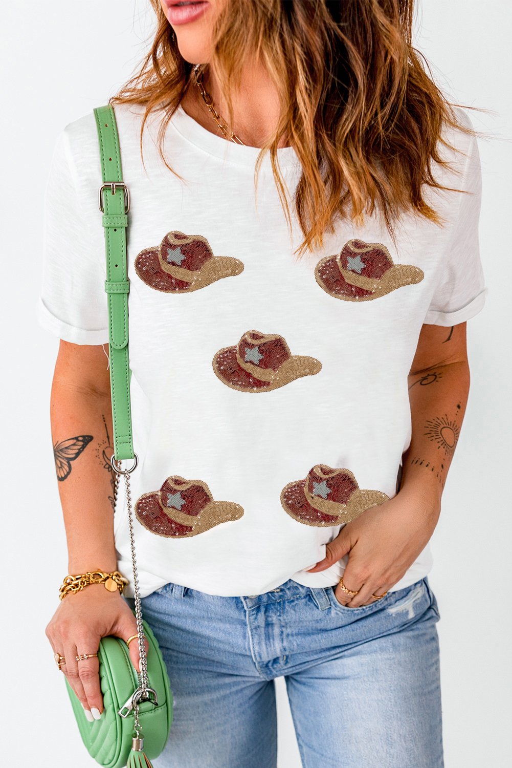 White Sequin Hats Graphic Round Neck T Shirt