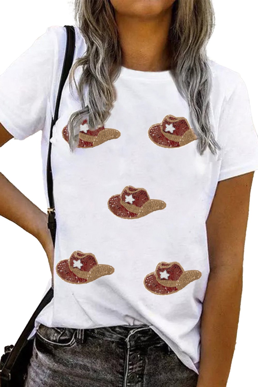 Home > White Sequin Hats Graphic Round Neck T Shirt