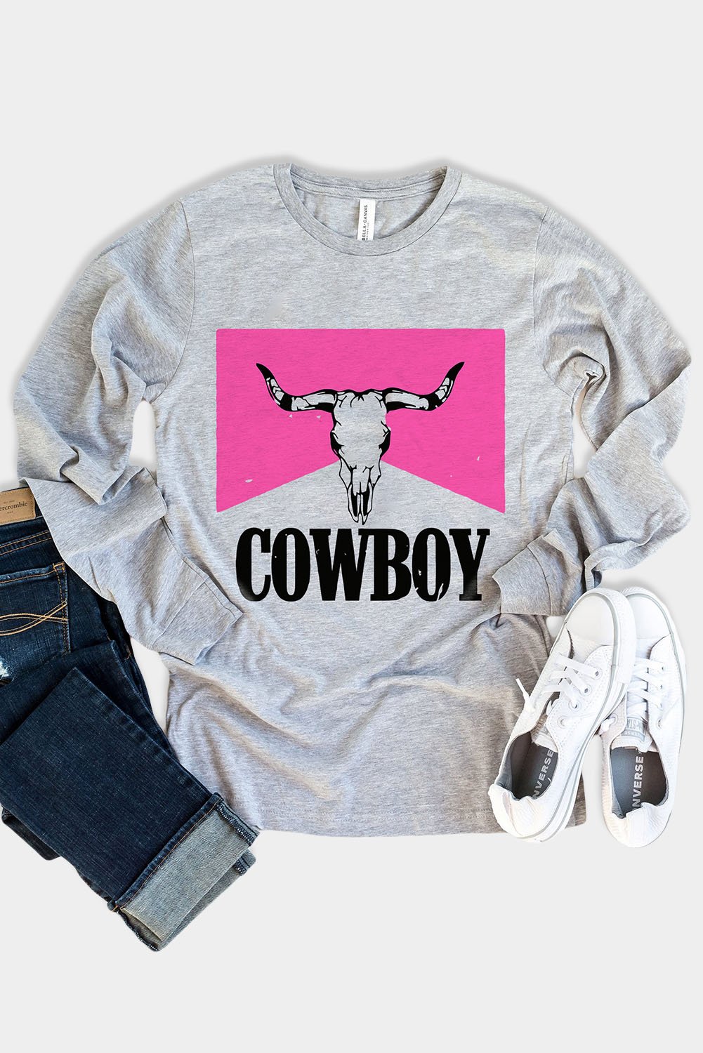 Gray Cowboy Steer Skull Print Western Grey Graphic Top