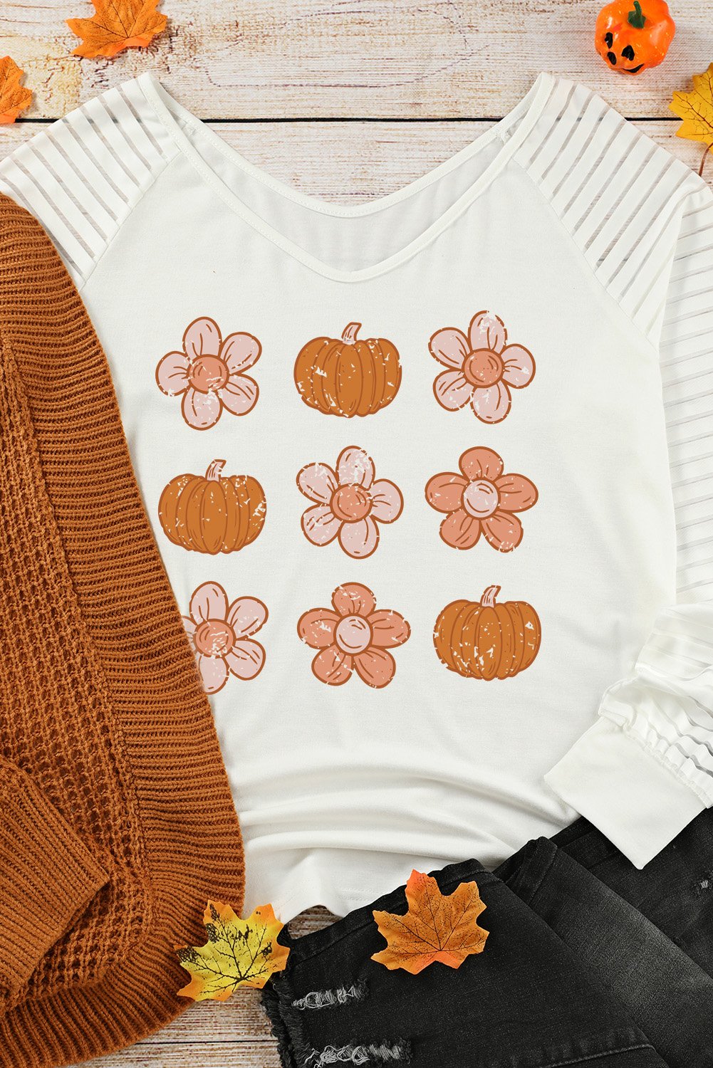 White Black Sheer-Stripe Floral Print V Neck Graphic Tee